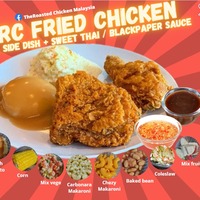 Serve with 2 complimentary side dish. We have mash potato, cheezy makaroni, carbonara makaroni, mix fruit, mix vege, corn & baked bean. Serve with 2 complimentary sauce black paper sauce & thai sauce.
