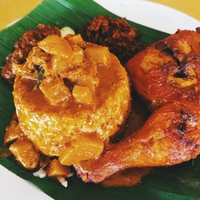 Nasi kukus dihidangkan bersama ayam golek berempah dari the roasted chicken bersama gulai kelantan , nenas, timun dan sambal limau kasturi kelantan